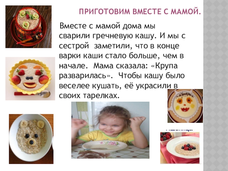 мамой дома мы сварили гречневую кашу. И мы с сестрой заметили, что в конце варки каши стало больше, чем в начале. Мама сказала: «Крупа разварилась». Чтобы кашу было веселее кушать, её украсили в своих тарелках.
