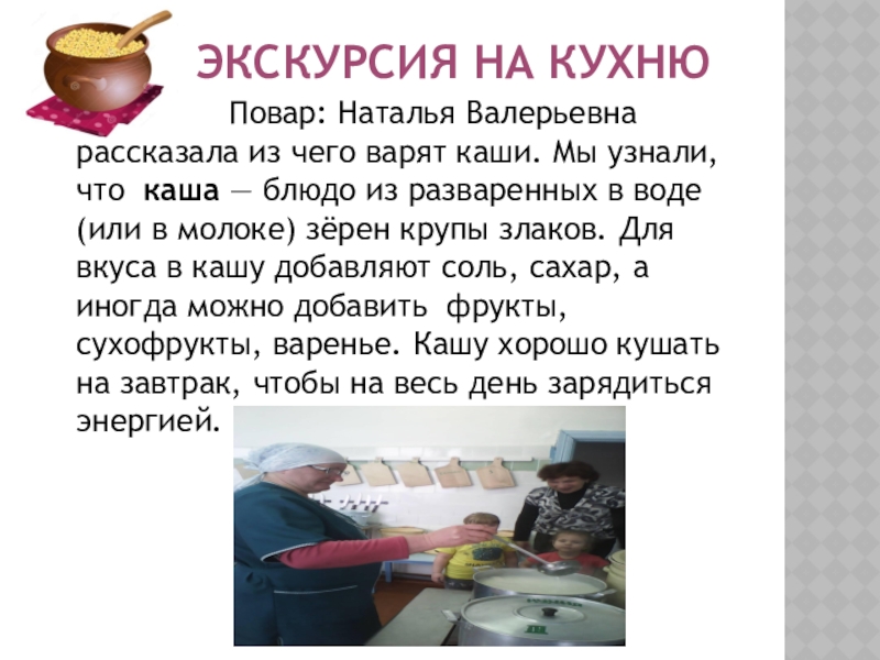 Наталья Валерьевна рассказала из чего варят каши. Мы узнали, что каша — блюдо из разваренных в воде (или в молоке) зёрен крупы злаков. Для вкуса в кашу добавляют соль, сахар, а иногда можно добавить фрукты, сухофрукты, варенье. Кашу хорошо кушать на завтрак, чтобы на весь день зарядиться энергией.