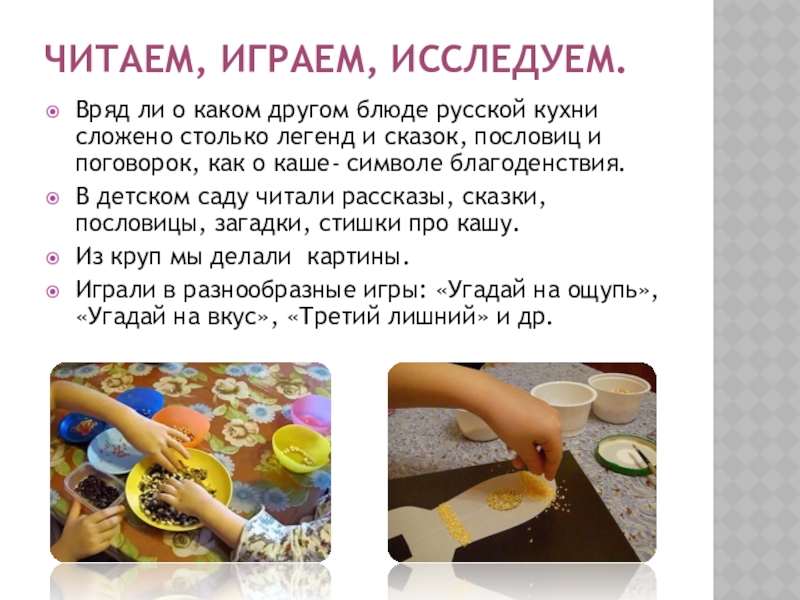 В детском саду читали рассказы, сказки, пословицы, загадки, стишки про кашу.