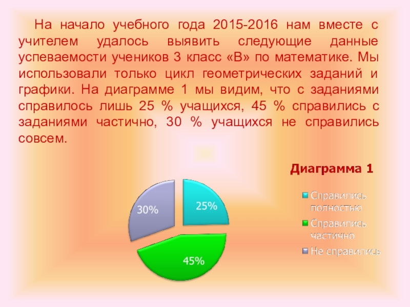 следующие данные успеваемости учеников 3 класс «В» по математике. Мы использовали только цикл геометрических заданий и графики. На диаграмме 1 мы видим, что с заданиями справилось лишь 25 % учащихся, 45 % справились с заданиями частично, 30 % учащихся не справились совсем.