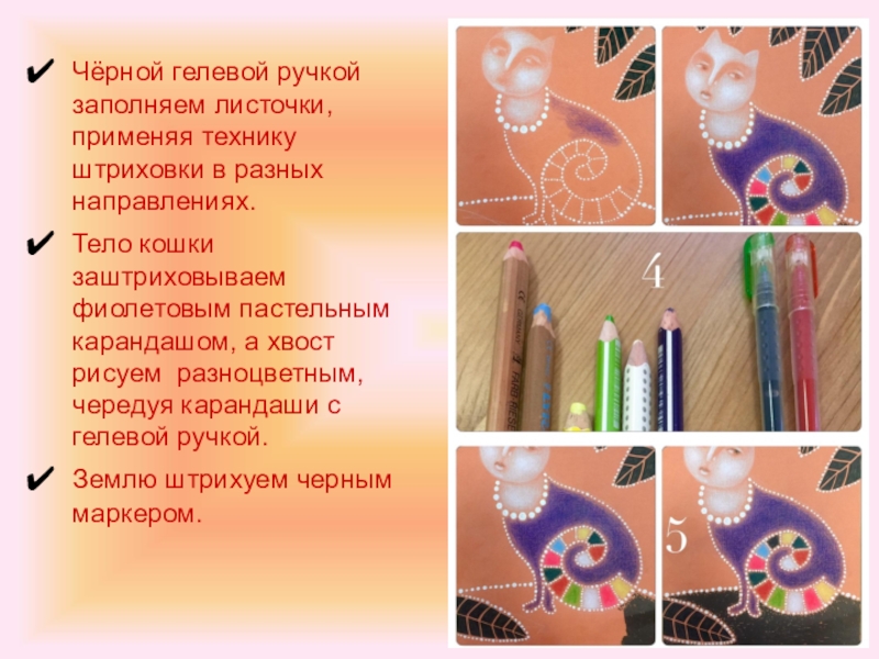 кошки заштриховываем фиолетовым пастельным карандашом, а хвост рисуем разноцветным, чередуя карандаши с гелевой ручкой.