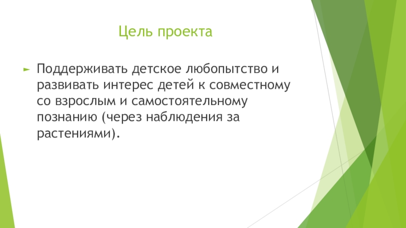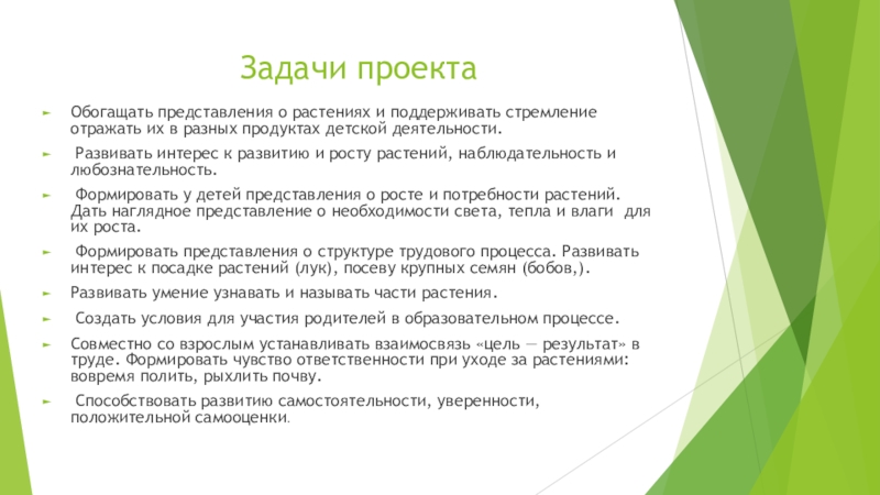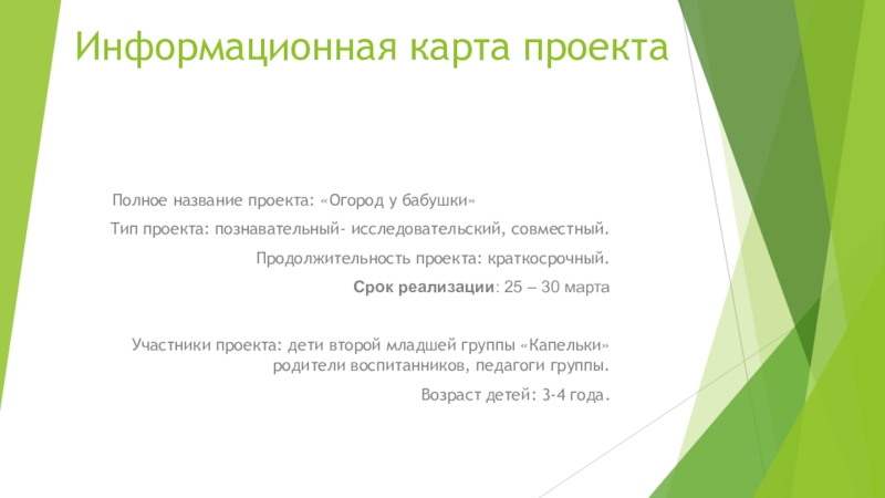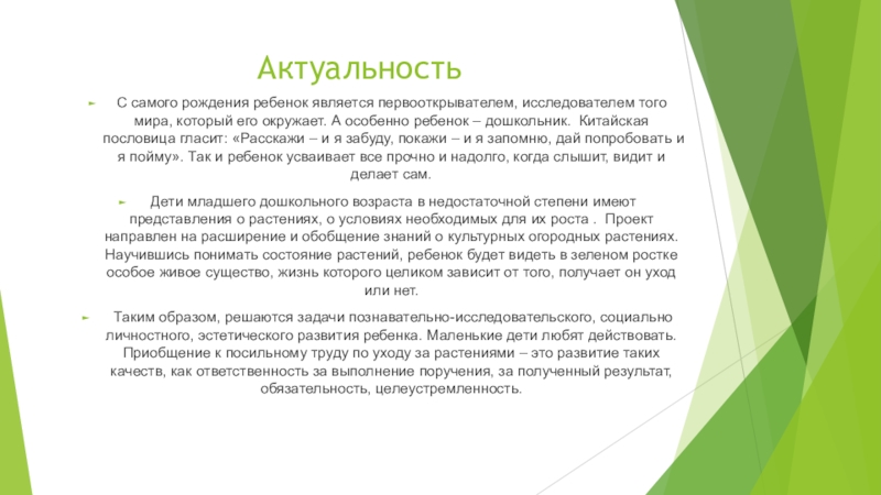 Дети младшего дошкольного возраста в недостаточной степени имеют представления о растениях, о условиях необходимых для их роста . Проект направлен на расширение и обобщение знаний о культурных огородных растениях. Научившись понимать состояние растений, ребенок будет видеть в зеленом ростке особое живое существо, жизнь которого целиком зависит от того, получает он уход или нет.