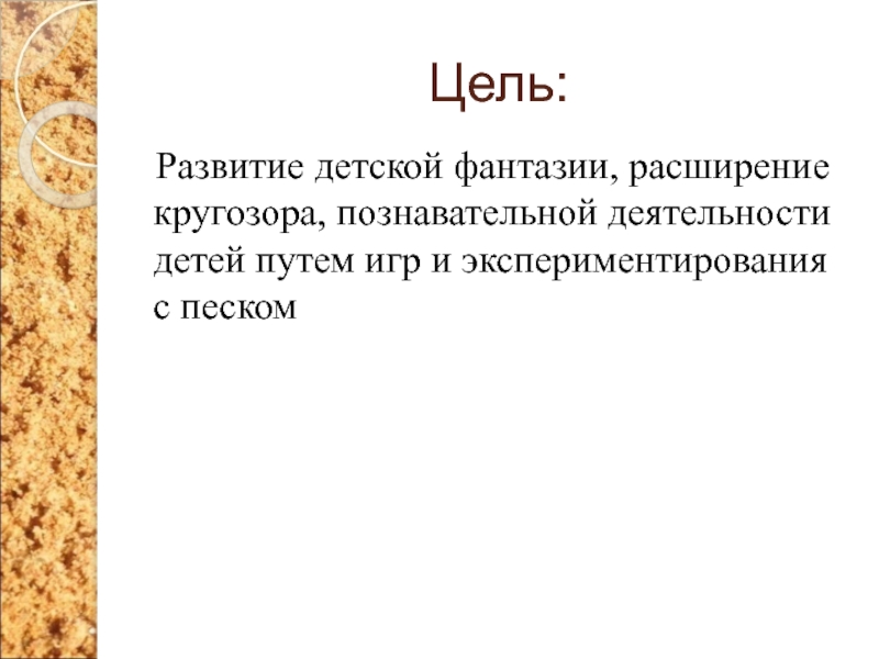 Цель:  Развитие детской фантазии, расширение кругозора, познавательной деятельности детей путем игр и экспериментирования с песком