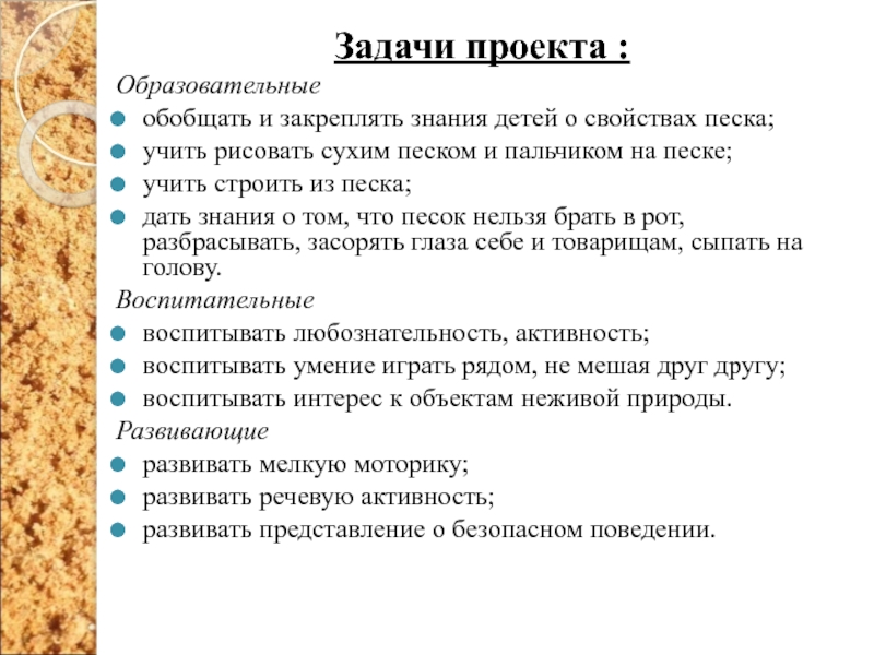 Задачи проекта :Образовательныеобобщать и закреплять знания детей о свойствах песка;учить рисовать сухим песком и пальчиком на песке;учить