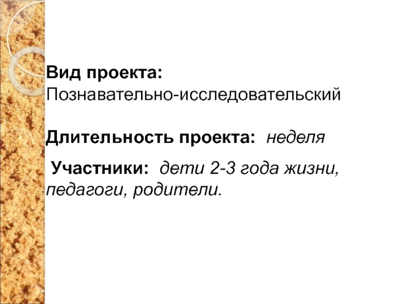 Вид проекта: Познавательно-исследовательский Длительность проекта: неделя Участники: дети 2-3 года жизни, педагоги, родители.