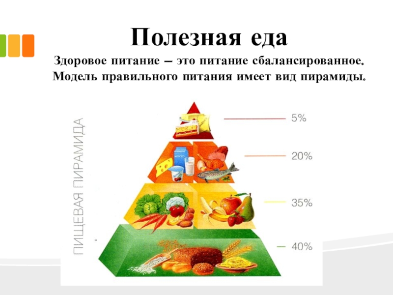 Полезная еда Здоровое питание – это питание сбалансированное. Модель правильного питания имеет вид пирамиды.