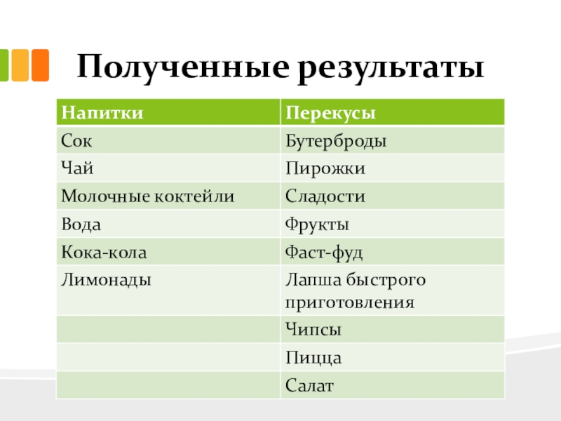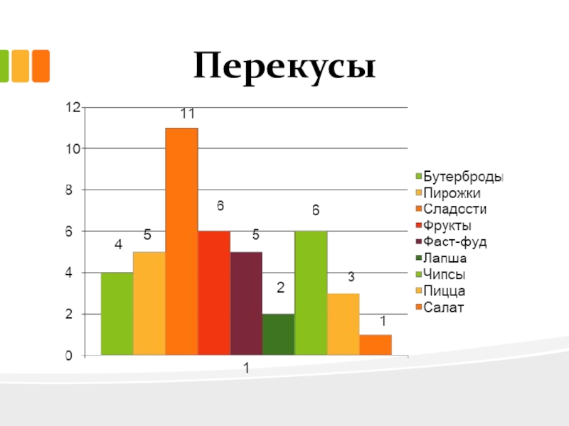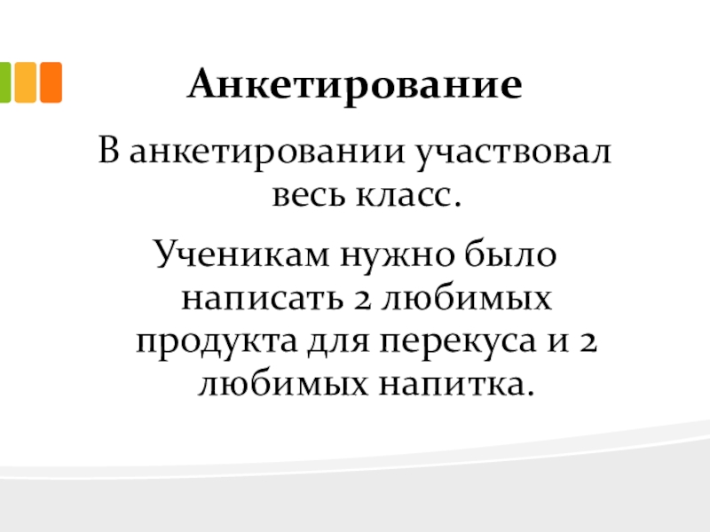 АнкетированиеВ анкетировании участвовал весь класс. Ученикам нужно было написать 2 любимых продукта для перекуса и 2 любимых