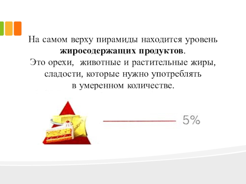 Слайд 9На самом верху пирамиды находится уровень жиросодержащих продуктов. Это орехи, животные