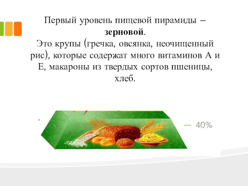 Слайд 6Первый уровень пищевой пирамиды – зерновой. Это крупы (гречка, овсянка, неочищенный