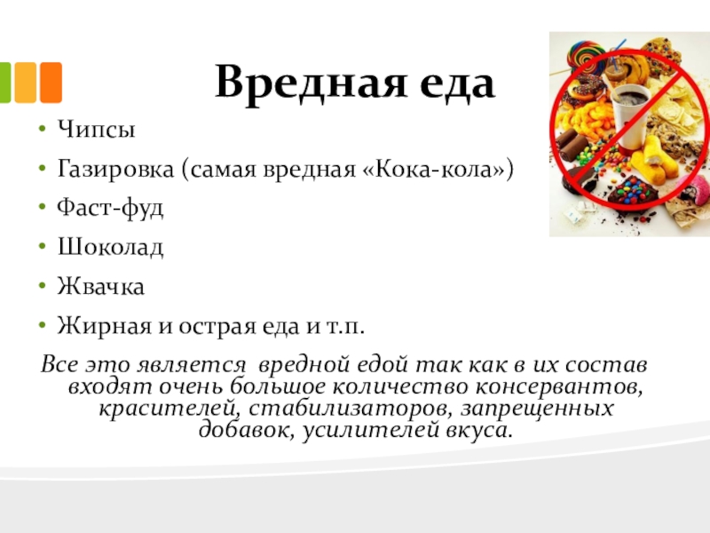Вредная едаЧипсыГазировка (самая вредная «Кока-кола»)Фаст-фудШоколадЖвачкаЖирная и острая еда и т.п.Все это является вредной едой так как в