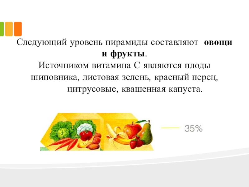 Слайд 7Следующий уровень пирамиды составляют овощи и фрукты. Источником витамина С являются