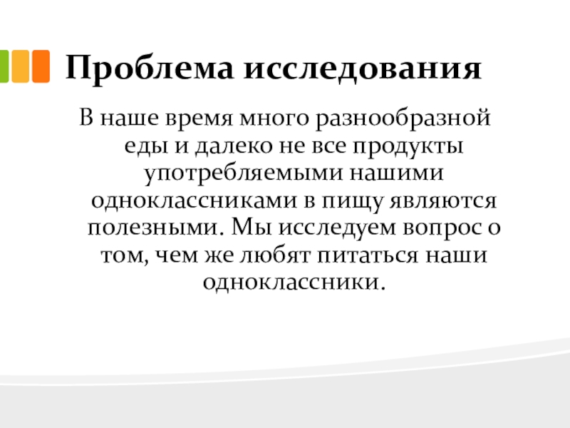 Проблема исследования В наше время много разнообразной еды и далеко не все продукты употребляемыми нашими одноклассниками в пищу являются полезными. Мы исследуем вопрос о том, чем же любят питаться наши одноклассники.