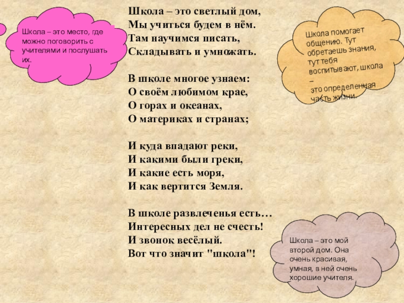 Школа – это мой второй дом. Она очень красивая, умная, в ней очень хорошие учителя.