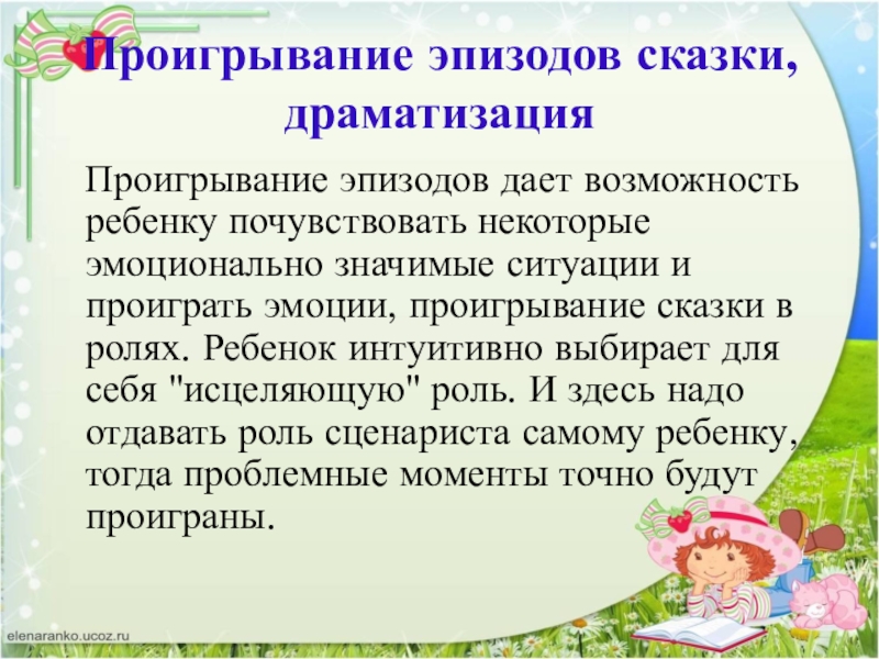 почувствовать некоторые эмоционально значимые ситуации и проиграть эмоции, проигрывание сказки в ролях. Ребенок интуитивно выбирает для себя "исцеляющую" роль. И здесь надо отдавать роль сценариста самому ребенку, тогда проблемные моменты точно будут проиграны.