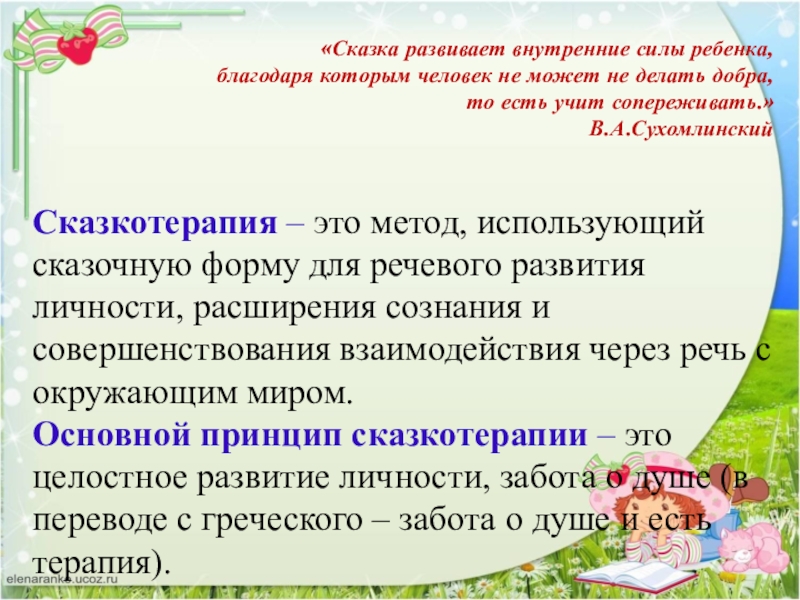 Основной принцип сказкотерапии – это целостное развитие личности, забота о душе (в переводе с греческого – забота о душе и есть терапия).