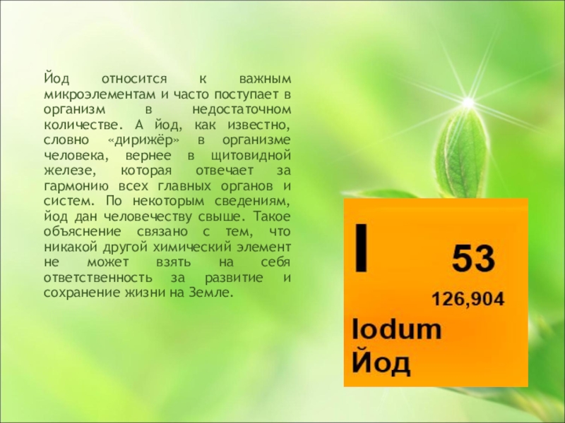 недостаточном количестве. А йод, как известно, словно «дирижёр» в организме человека, вернее в щитовидной железе, которая отвечает за гармонию всех главных органов и систем. По некоторым сведениям, йод дан человечеству свыше. Такое объяснение связано с тем, что никакой другой химический элемент не может взять на себя ответственность за развитие и сохранение жизни на Земле.