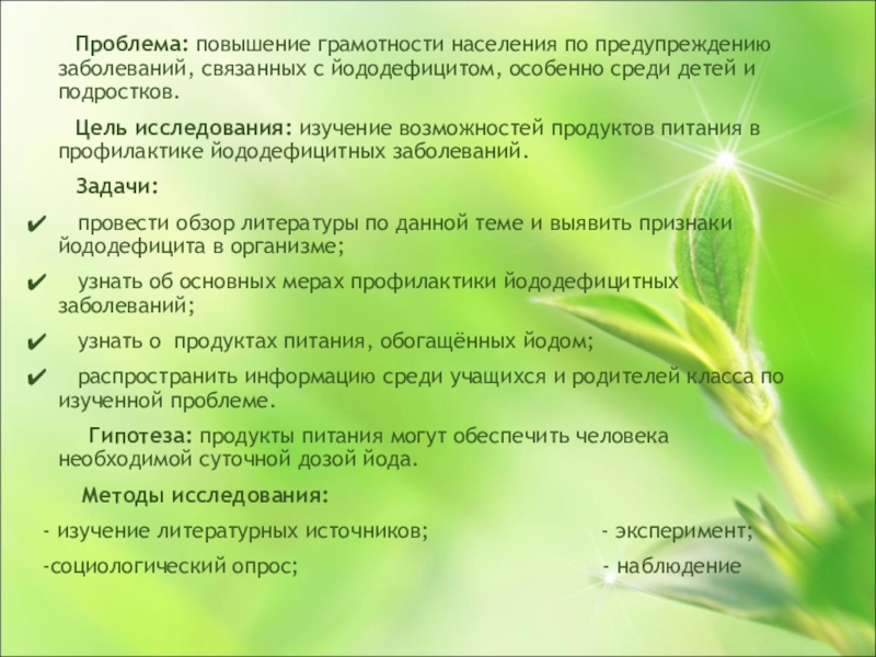 Цель исследования: изучение возможностей продуктов питания в профилактике йододефицитных заболеваний.
