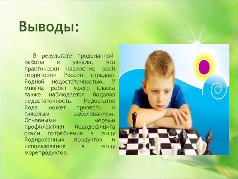 население всей территории России страдает йодной недостаточностью. У многих ребят моего класса также наблюдается йодовая недостаточность. Недостаток йода может привести к тяжёлым заболеваниям. Основными мерами профилактики йододефицита стали потребление в пищу йодированных продуктов и использование в пищу морепродуктов.