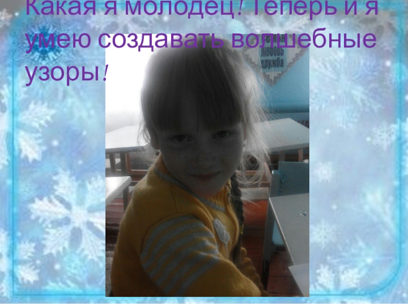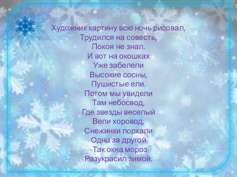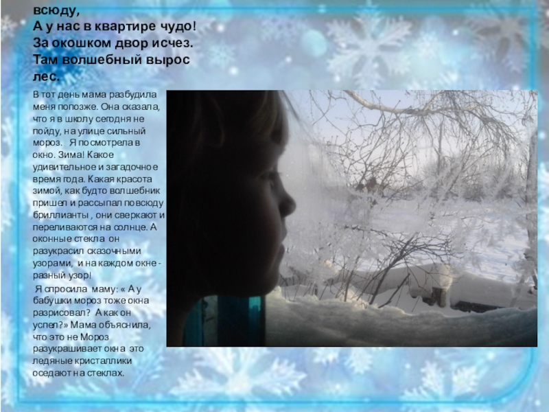 В тот день мама разбудила меня попозже. Она сказала, что я в школу сегодня не пойду, на улице сильный мороз. Я посмотрела в окно. Зима! Какое удивительное и загадочное время года. Какая красота зимой, как будто волшебник пришел и рассыпал повсюду бриллианты , они сверкают и переливаются на солнце. А оконные стекла он разукрасил сказочными узорами, и на каждом окне - разный узор!