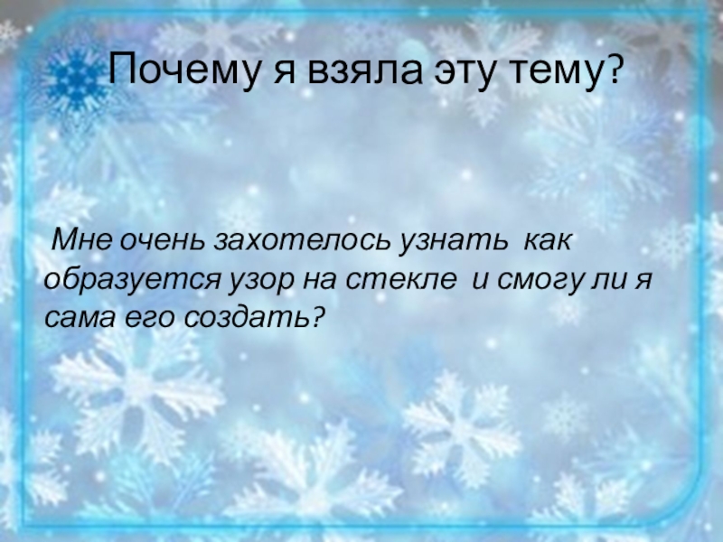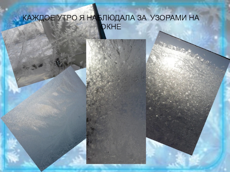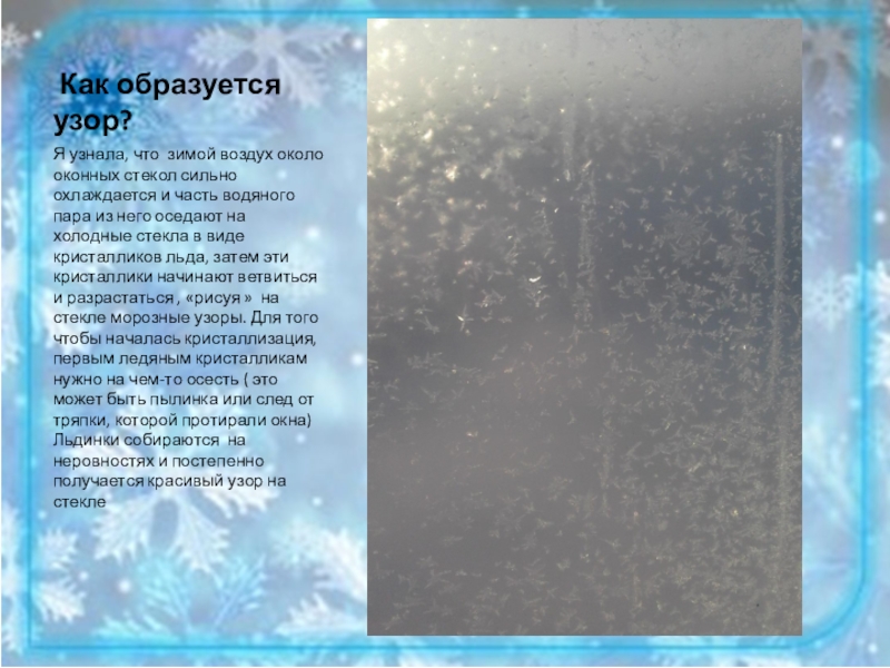Я спросила маму: « А у бабушки мороз тоже окна разрисовал? А как он успел?» Мама объяснила, что это не Мороз разукрашивает окна это ледяные кристаллики оседают на стеклах.