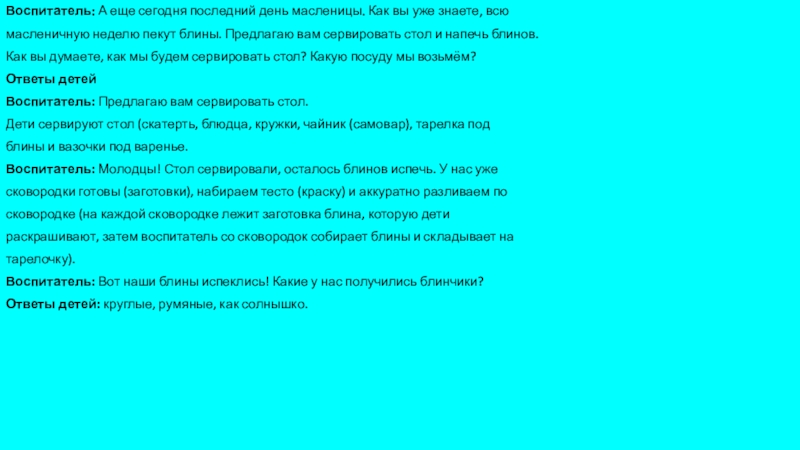 Воспитатель: Молодцы! Стол сервировали, осталось блинов испечь. У нас уже
