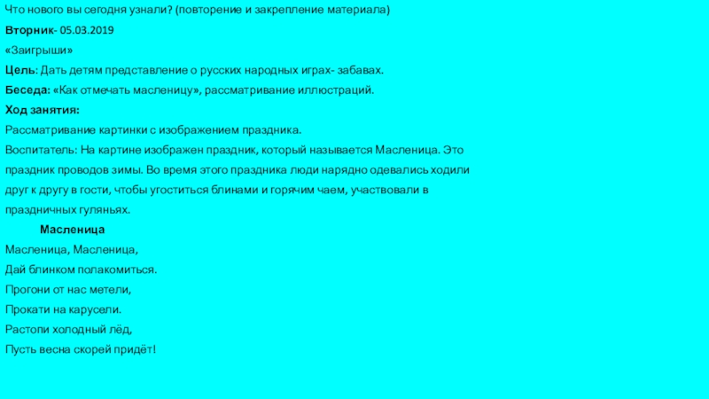 - Познакомить с народным праздником Масленица