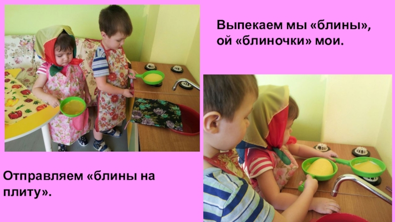 сковородке (на каждой сковородке лежит заготовка блина, которую дети