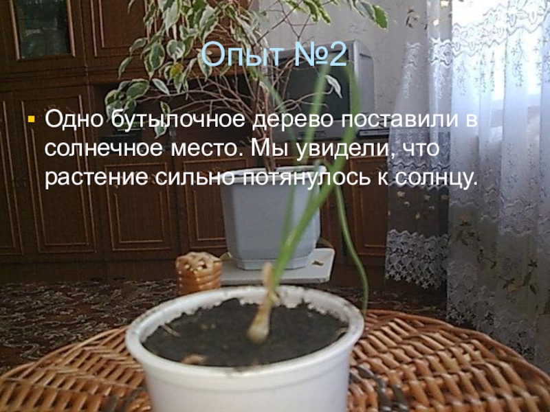 Опыт №2Одно бутылочное дерево поставили в солнечное место. Мы увидели, что растение сильно потянулось к солнцу.