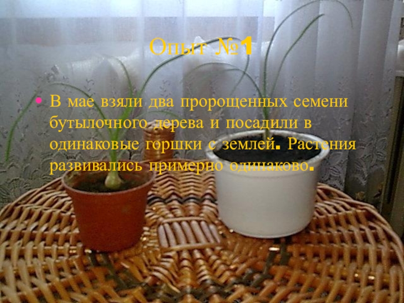Опыт №1В мае взяли два пророщенных семени бутылочного дерева и посадили в одинаковые горшки с землей. Растения