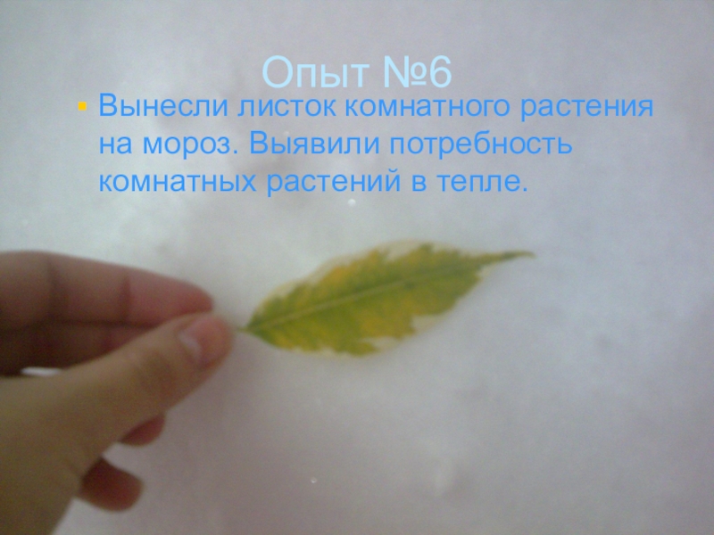 Опыт №6Вынесли листок комнатного растения на мороз. Выявили потребность комнатных растений в тепле.