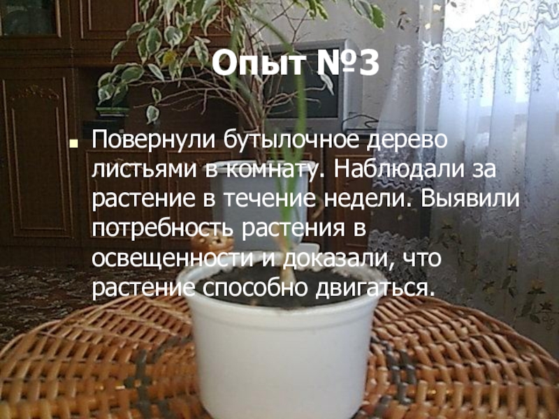 Опыт №3Повернули бутылочное дерево листьями в комнату. Наблюдали за растение в течение недели. Выявили потребность растения в