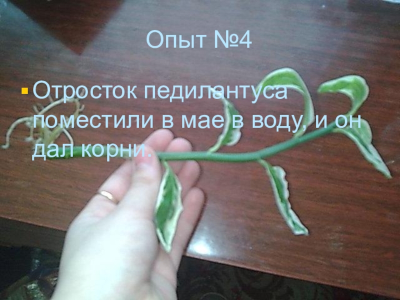 Опыт №4Отросток педилантуса поместили в мае в воду, и он дал корни.