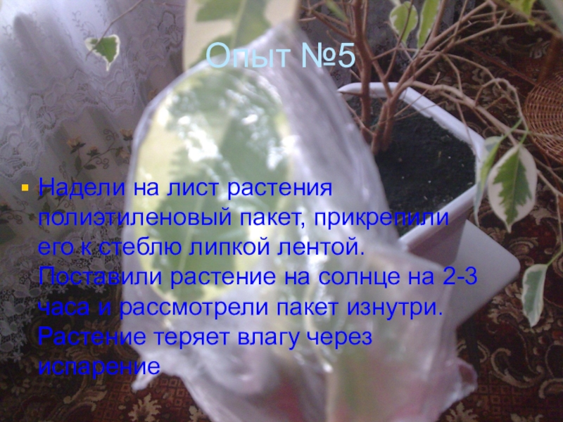 Опыт №5Надели на лист растения полиэтиленовый пакет, прикрепили его к стеблю липкой лентой. Поставили растение на солнце