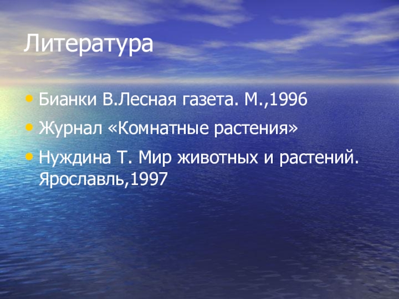 Литература Бианки В.Лесная газета. М.,1996Журнал «Комнатные растения»Нуждина Т. Мир животных и растений. Ярославль,1997