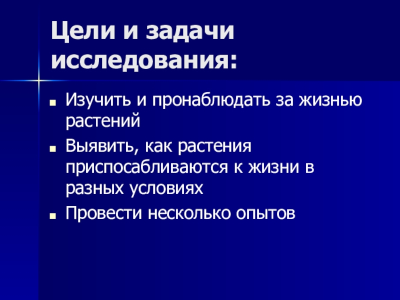 Цели и задачи исследования:Изучить и пронаблюдать за жизнью растенийВыявить, как растения приспосабливаются к жизни в разных условияхПровести