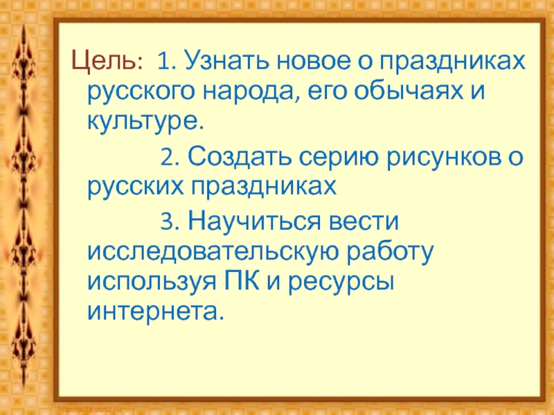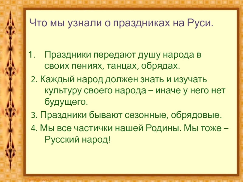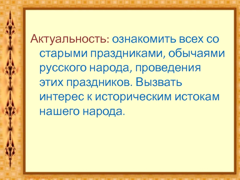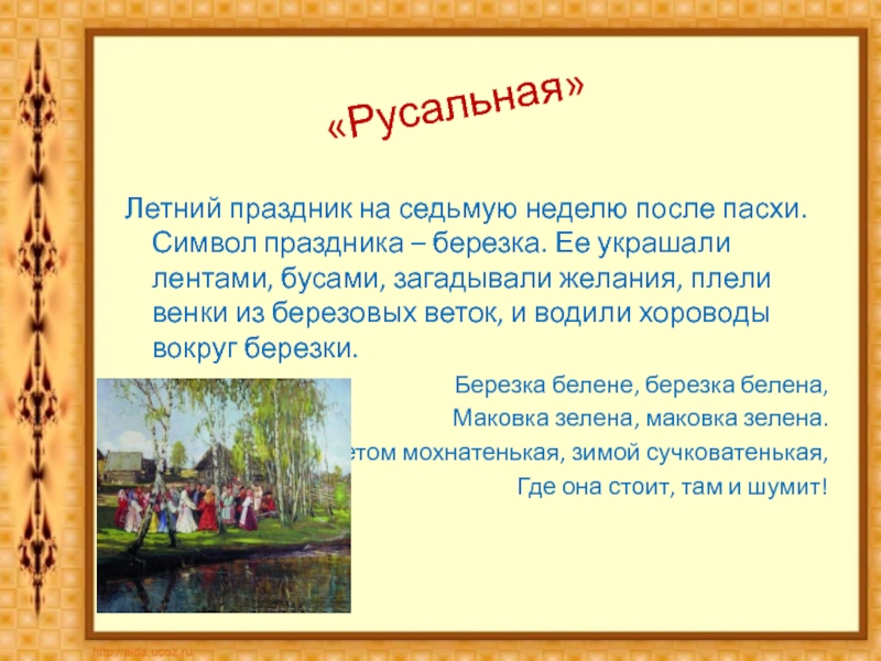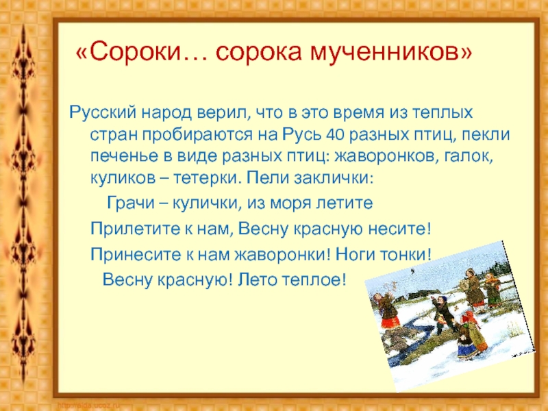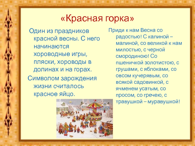 Приди к нам Весна со радостью! С калиной – малиной, со великой к нам милостью, с черной смородиною! Со пшеничкой золотистою, с грушами, с яблоками, со овсом кучерявым, со всякой садовинкой, с ячменем усатым, со просом, со гречею, с травушкой – муравушкой!