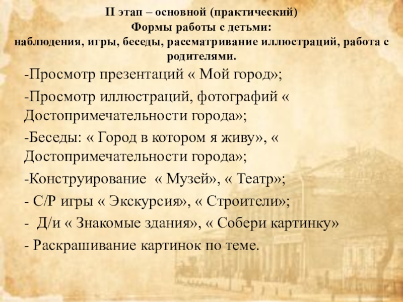 -Беседы: « Город в котором я живу», « Достопримечательности города»;