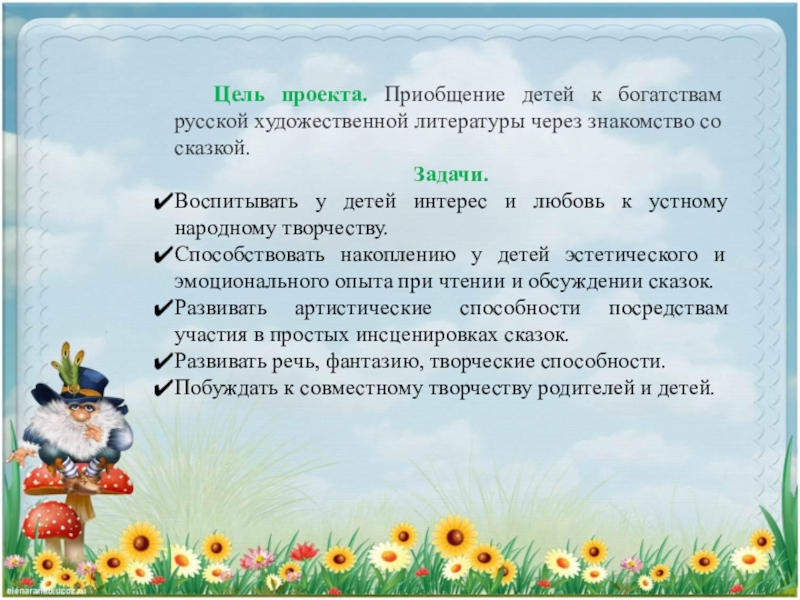 Слайд 2Цель проекта. Приобщение детей к богатствам русской художественной литературы через знакомство