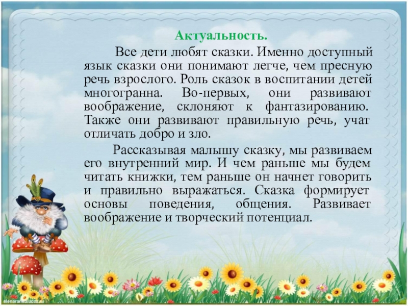 доступный язык сказки они понимают легче, чем пресную речь взрослого. Роль сказок в воспитании детей многогранна. Во-первых, они развивают воображение, склоняют к фантазированию. Также они развивают правильную речь, учат отличать добро и зло.