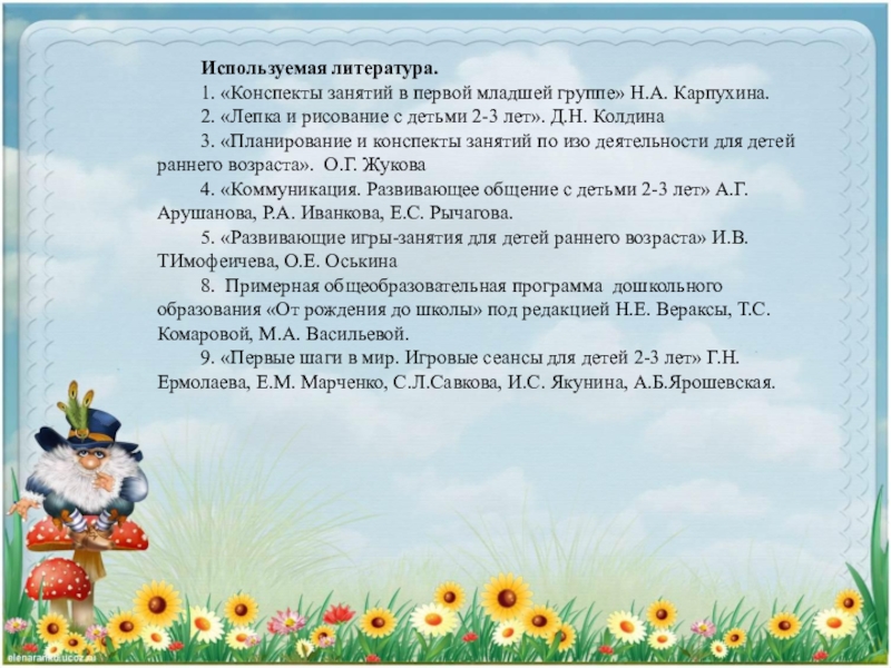 1. «Конспекты занятий в первой младшей группе» Н.А. Карпухина.