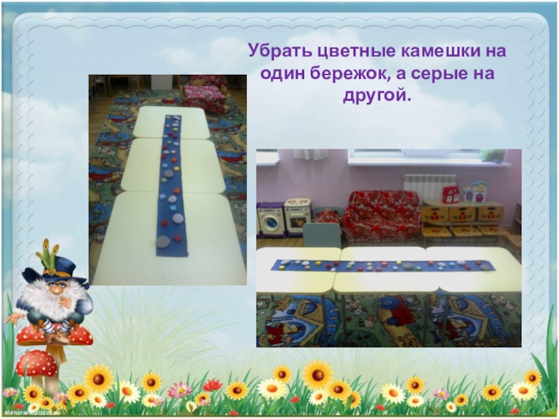 Слайд 16Убрать цветные камешки на один бережок, а серые на другой.