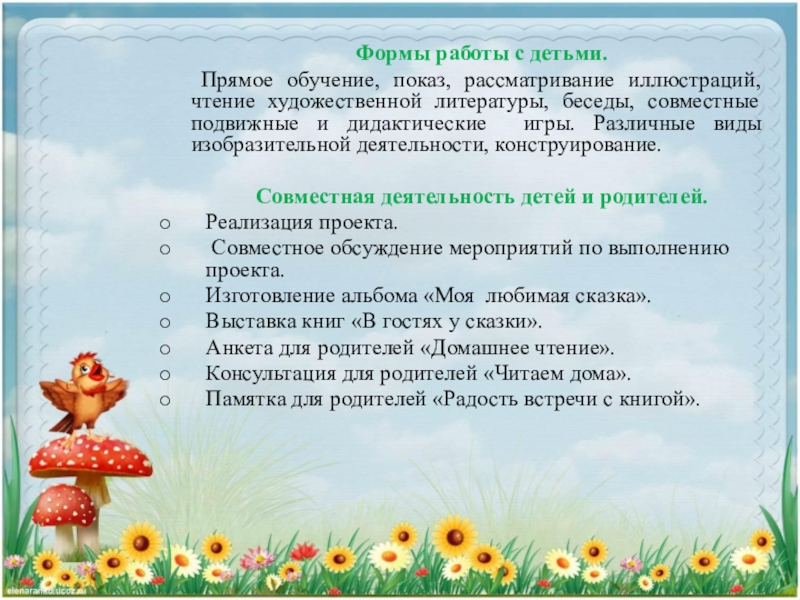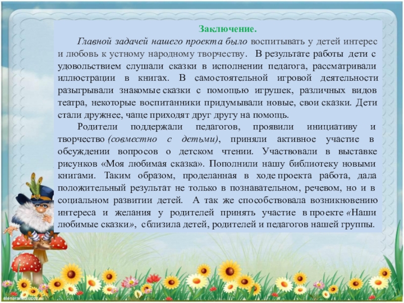 к устному народному творчеству. В результате работы дети с удовольствием слушали сказки в исполнении педагога, рассматривали иллюстрации в книгах. В самостоятельной игровой деятельности разыгрывали знакомые сказки с помощью игрушек, различных видов театра, некоторые воспитанники придумывали новые, свои сказки. Дети стали дружнее, чаще приходят друг другу на помощь.