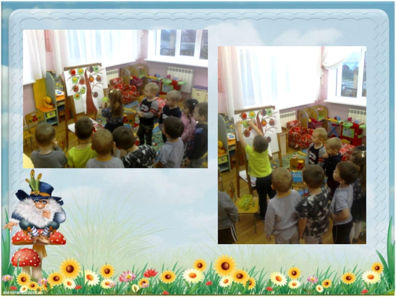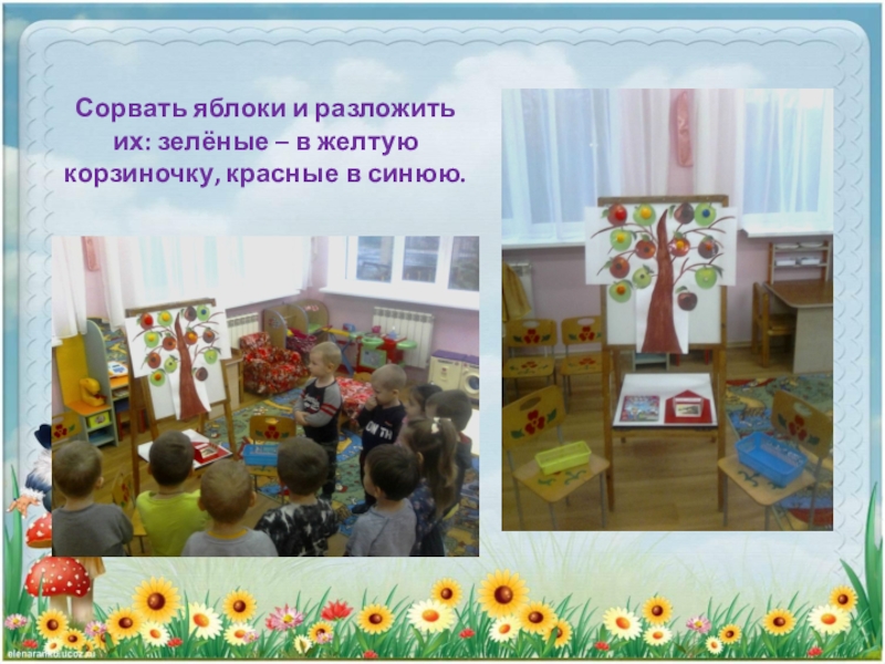 Слайд 13Сорвать яблоки и разложить их: зелёные – в желтую корзиночку, красные