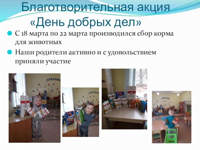 Благотворительная акция «День добрых дел»С 18 марта по 22 марта производился сбор корма для животныхНаши родители активно и с удовольствием приняли участие