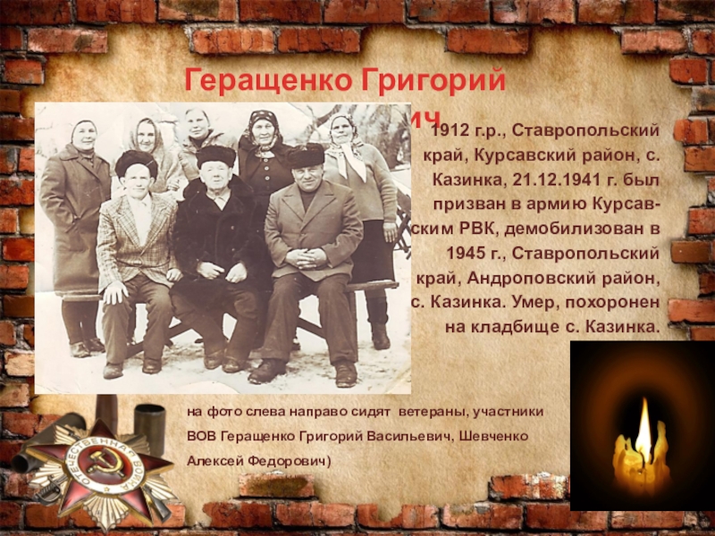 на фото слева направо сидят ветераны, участники ВОВ Геращенко Григорий Васильевич, Шевченко Алексей Федорович)