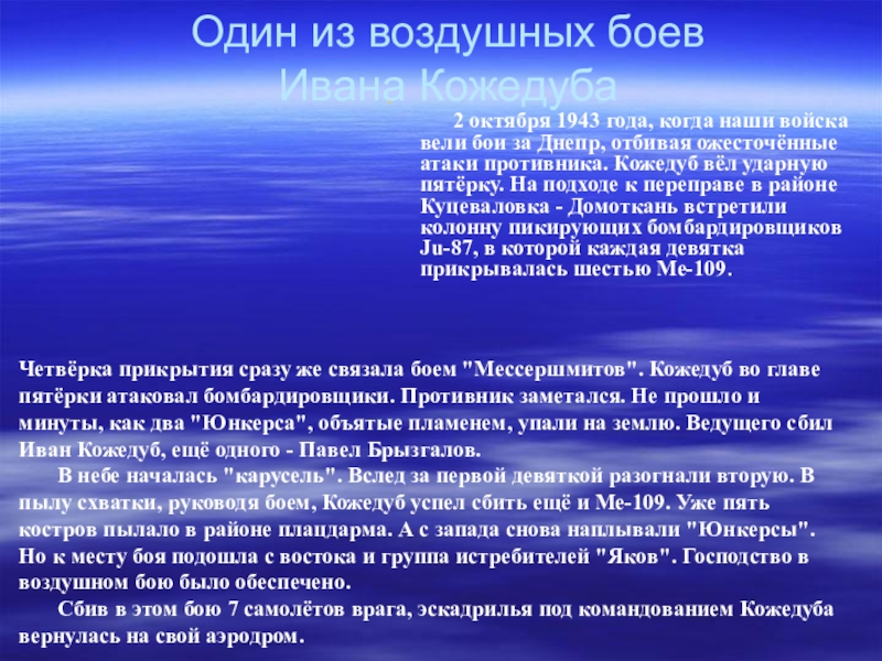 В небе началась "карусель". Вслед за первой девяткой разогнали вторую. В пылу схватки, руководя боем, Кожедуб успел сбить ещё и Ме-109. Уже пять костров пылало в районе плацдарма. А с запада снова наплывали "Юнкерсы". Но к месту боя подошла с востока и группа истребителей "Яков". Господство в воздушном бою было обеспечено.