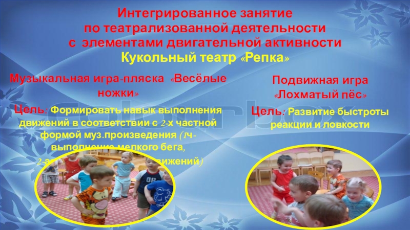 Цель: Формировать навык выполнения движений в соответствии с 2-х частной формой муз.произведения (1ч-выполнение мелкого бега,