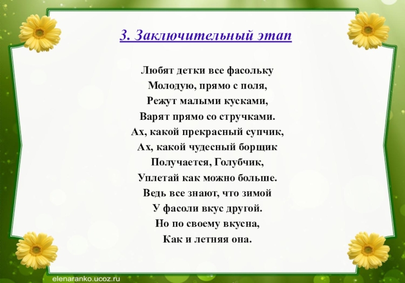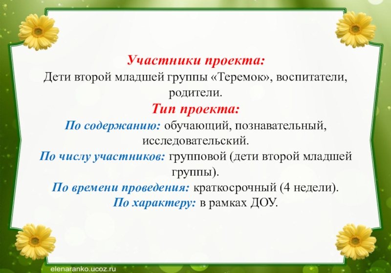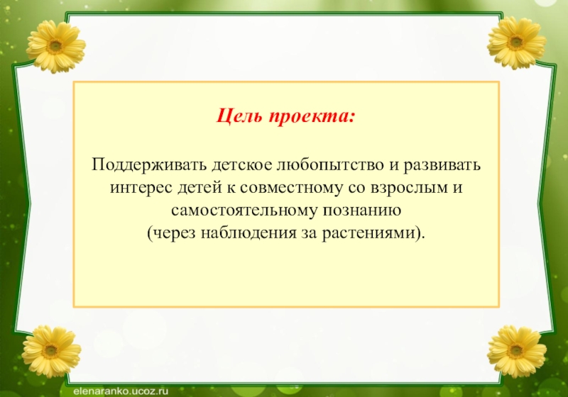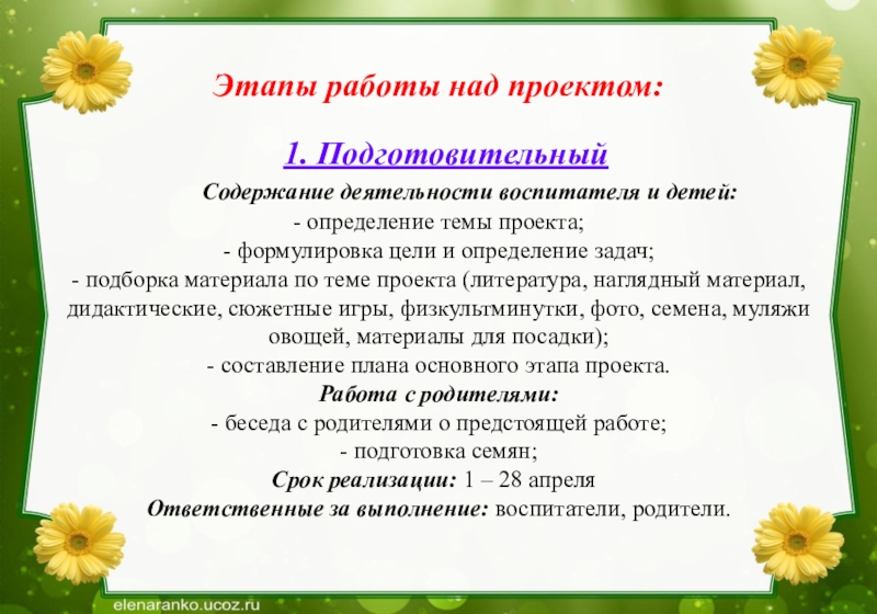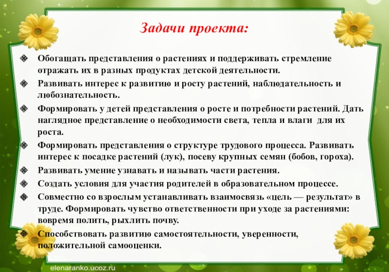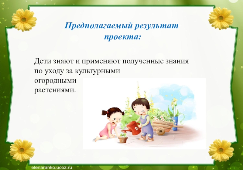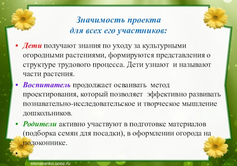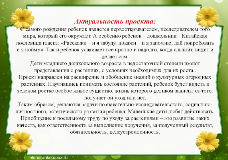 Проект направлен на расширение и обобщение знаний о культурных огородных растениях. Научившись понимать состояние растений, ребенок будет видеть в зеленом ростке особое живое существо, жизнь которого целиком зависит от того, получает он уход или нет.