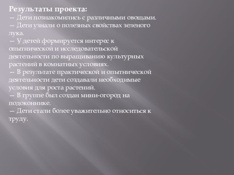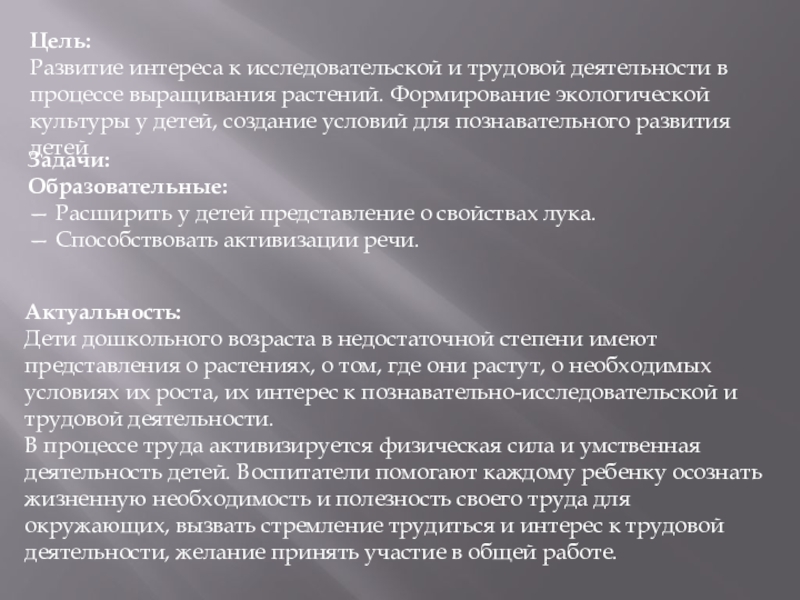 Дети дошкольного возраста в недостаточной степени имеют представления о растениях, о том, где они растут, о необходимых условиях их роста, их интерес к познавательно-исследовательской и трудовой деятельности.