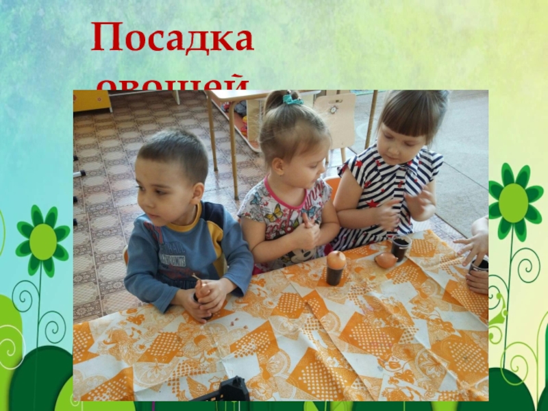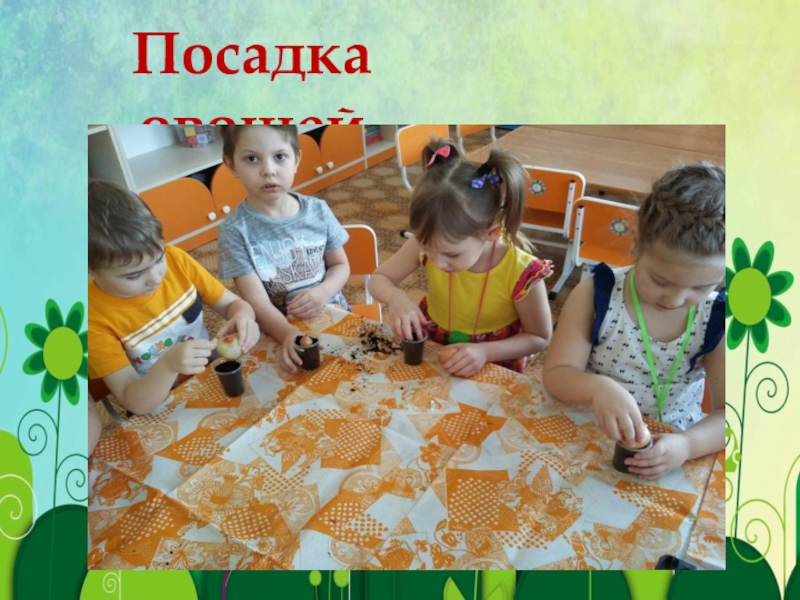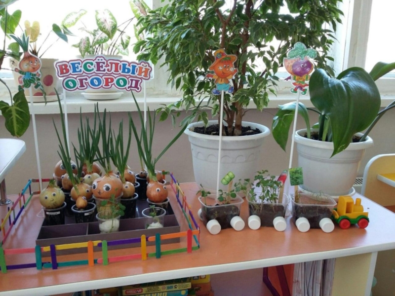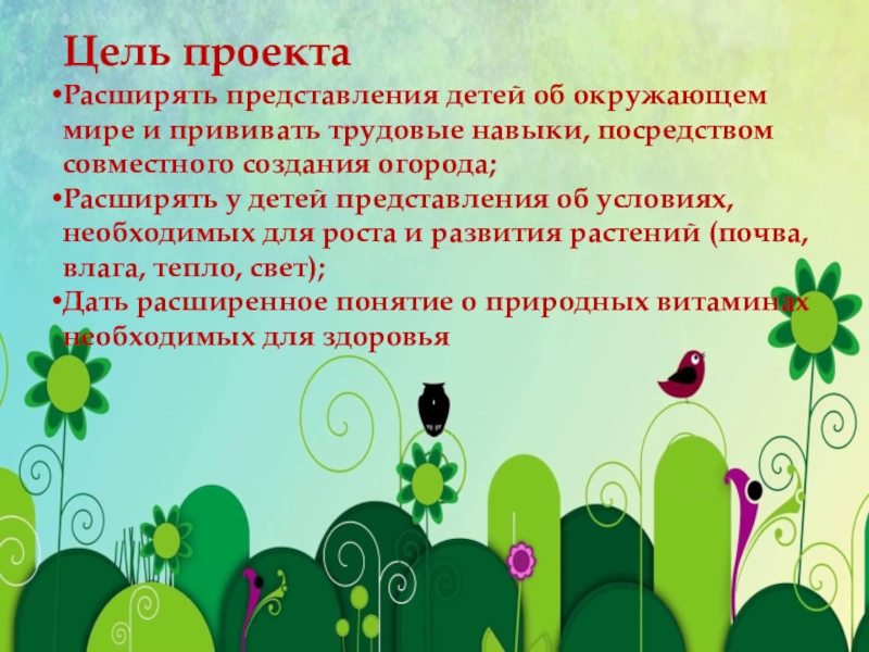 Цель проектаРасширять представления детей об окружающем мире и прививать трудовые навыки, посредством совместного создания огорода;Расширять у детей представления об условиях, необходимых для роста и развития растений (почва, влага, тепло, свет);Дать расширенное понятие о природных витаминах необходимых